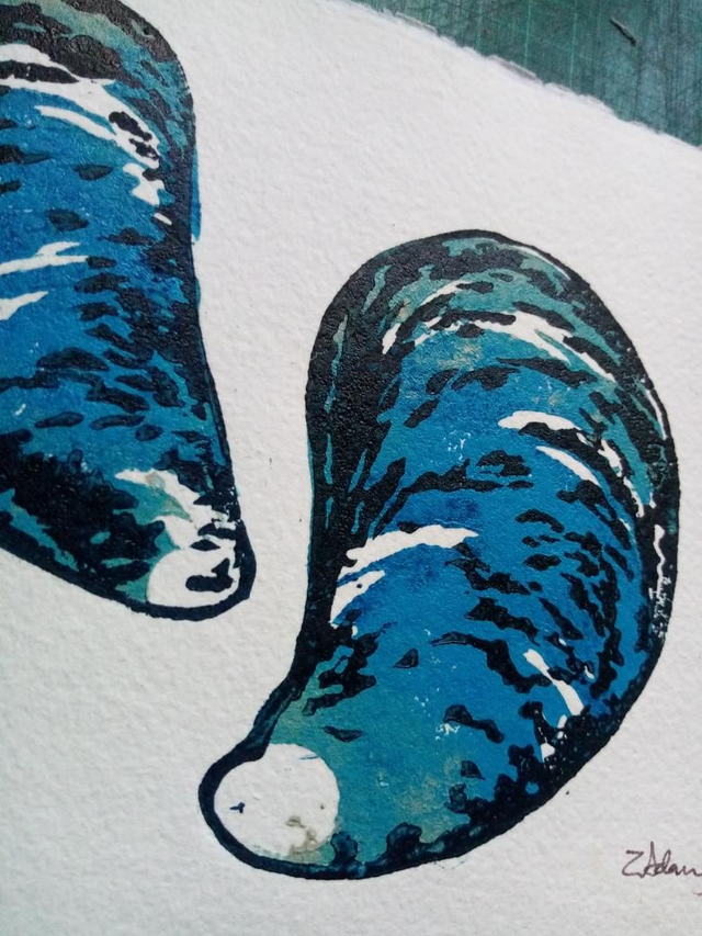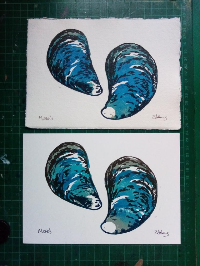 An A5, 2 layer print of mussel shells! On either smooth cartridge paper or textured cotton rag paper.